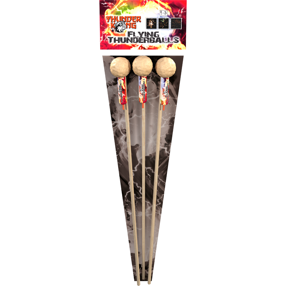 Effektbeschreibung Flying Thunderballs sind drei spektakuläre Raketen, jede mit einem dicken Burst! Von der leuchtenden Crown über die goldene Coco bis hin zu den Crackling Strobes. Maximale Effekte!