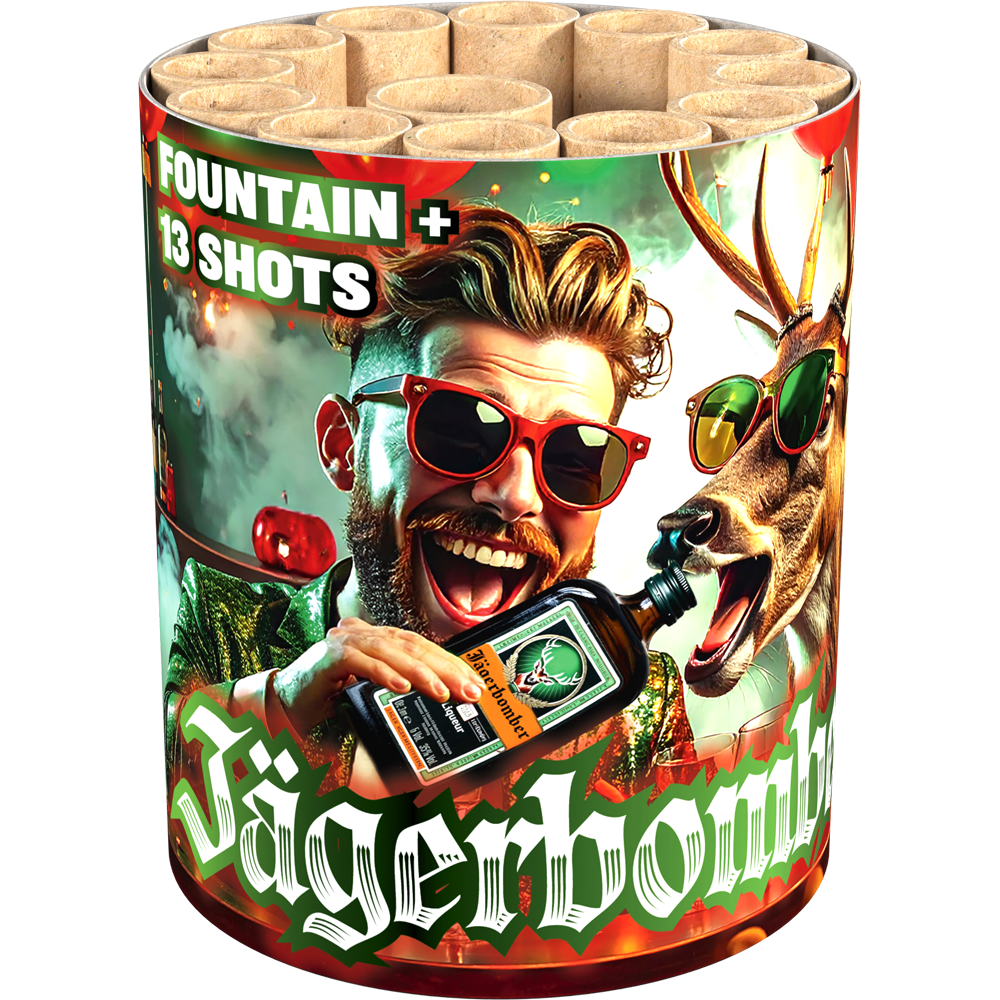 Effektbeschreibung Fängt mit einer knalligen Fontäne an und gibt 13 Schüsse einzeln ab… „Jägerbomber“! Diese Batterie bietet eine Mischung aus roten, grünen und blauen Sternen, goldenen Palmen und funkelnden Chrysanthemen – 33 Sekunden purer Feuerwerkspaß!