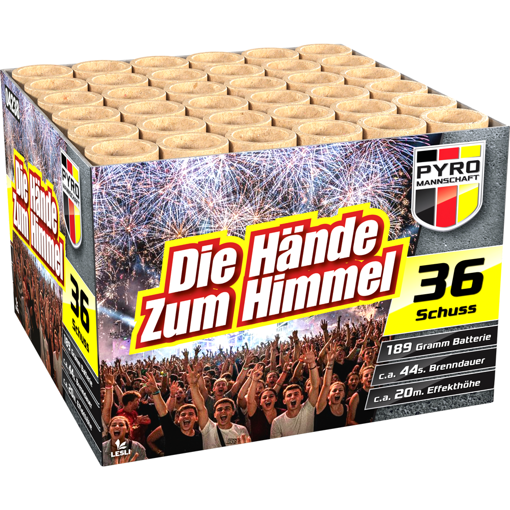| Effektbeschreibung | Hände hoch! 36 goldene Palmen und bunte Blumen schießen zuerst einzeln, dann zusammen und lassen dich fast den Himmel berühren – ein pures Spektakel zum feiern! Dann mal „Die Hände Zum Himmel“! |