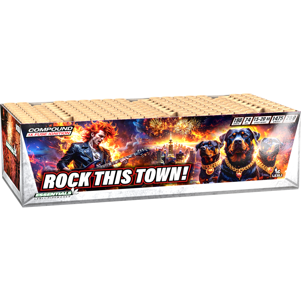 | Effektbeschreibung | Laß die Umgebung beben mit einer explosiven Mischung aus roten, grünen und goldenen Palmen, Pfingstrosen und Geisterblitzen! Von „V“- bis „W“-förmigen Effekten – „Rock This Town“! spielt die ultimative Feuerwerkssymphonie – und sie dauert nicht weniger als 60-70 Sekunden. So rockt man die Stadt!! |