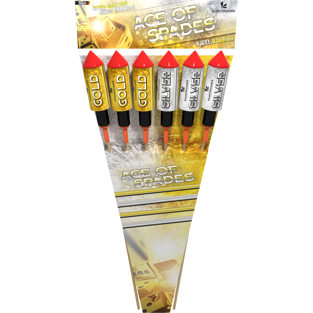 | Effektbeschreibung | 6 Maximal gefüllte Raketen mit lautem Burst-Knall. 3 Stück in Silber und 3 Stück in Gold ausgeführt. Spitzenqualität! |