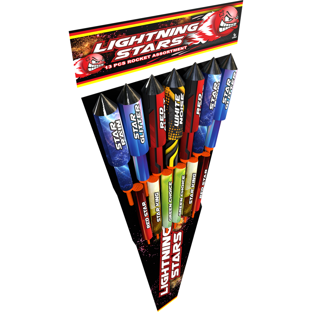 Effektbeschreibung 13 prächtige Raketen in 2 Formaten und verschiedenen Effekten. Mit diesen Raketen verändert sich die Nacht in „Lightning Stars“!