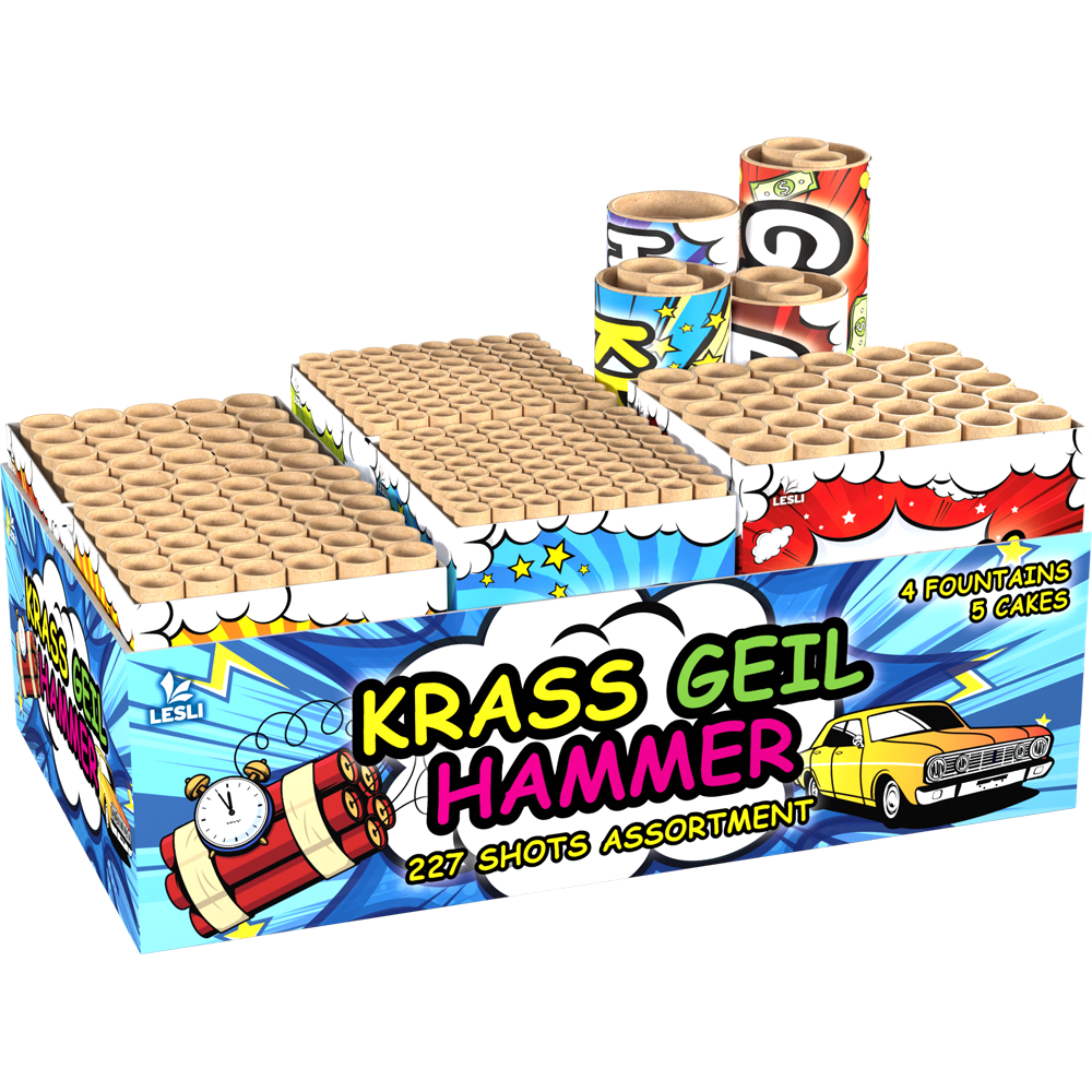 Effektbeschreibung Jede Explosion ist ein BAM! Dank „Krass Geil Hammer“, dem Sortiment mit insgesamt 227 Schüssen aus Farbe und Feuer!