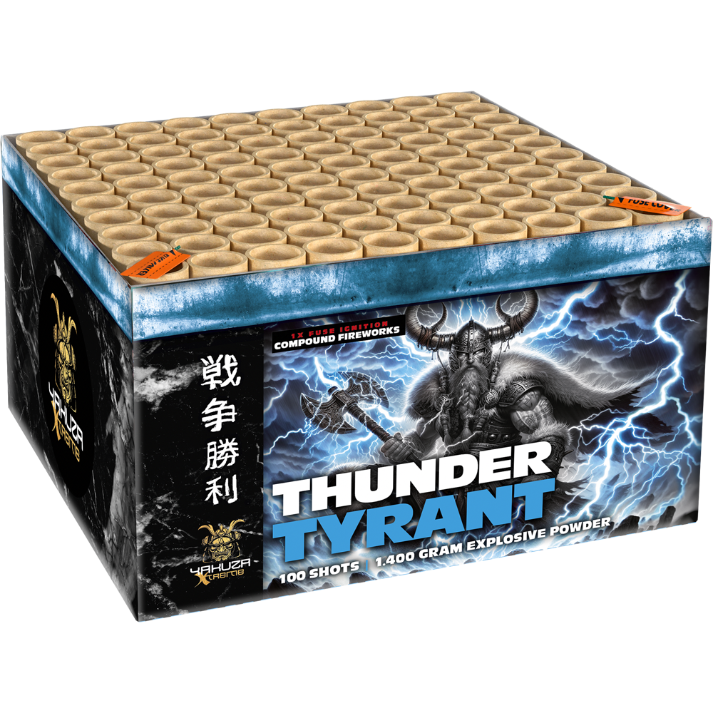 Effektbeschreibung Dieser Herrscher die Lüfte duldet keinen Widerspruch: Blitzschnell feuert er Reihen goldfarbener Chrysanthemen mit roten, blauen und grünen Schweifen ab. Reihe für Reihe steigert sich die Spannung – bis im Finale alles gleichzeitig explodiert und der Thunder Tyrant seine ganze Macht zeigt.