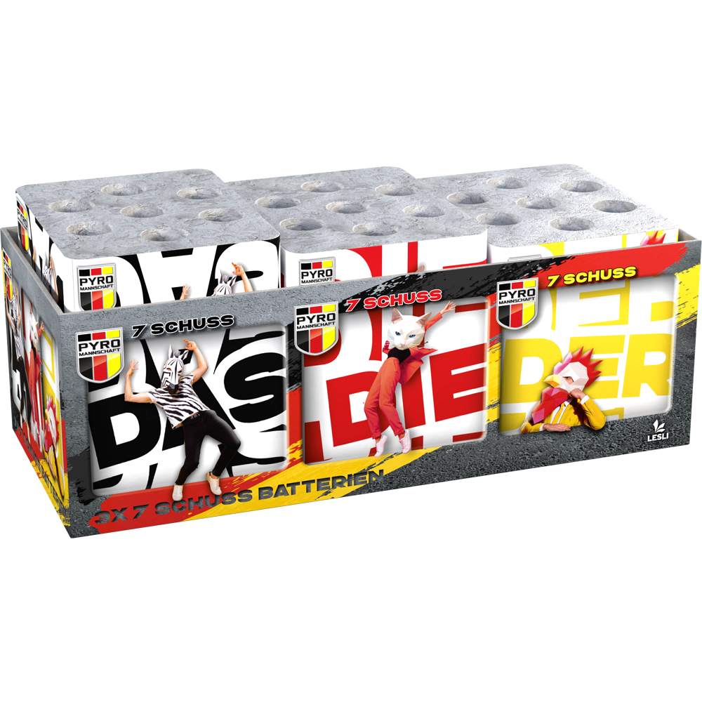 | Effektbeschreibung | Tolles Sortiment von 3 stabilen Multi-Effekt Batterien. Insgesamt 21 Schuss Feuerwerkspass! |