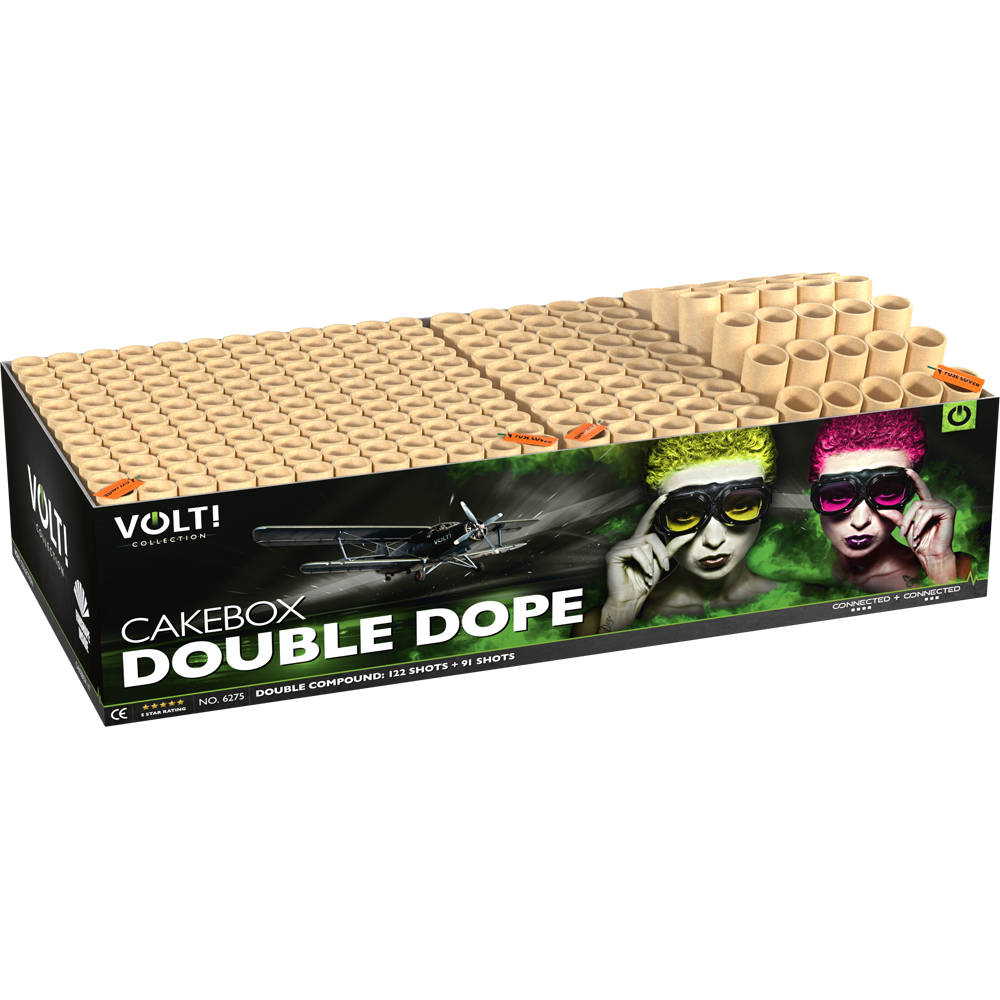 | Effektbeschreibung | Diese Box ist definitiv Double Dope, denn du hast hier 2 sehr dicke Verbünde in deinen Händen! Die schönsten Farben und neuesten Effekte werden in verschiedenen Schritten kombiniert und das Finale von Verbund 2 ist ein starkes Stück Pyrotechnik. Bist du auch doppelt gedopt? |