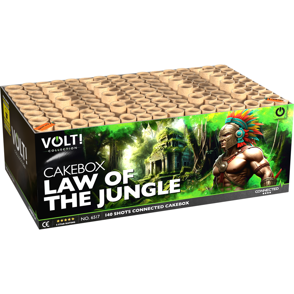 | Effektbeschreibung | Nach dem Gesetz des Dschungels überleben nur die Stärksten – und stark ist dieser 140-Schuss-Compound allemal. Noch nie dagewesene, extrem hohe und breite Effekte lassen dich seinem Bann nicht mehr entkommen. Mit 30-mm-Rohren und fast 2 kg maximal gefüllter Effektsätzen lässt dir Law Of The Jungle keine Chance. Eine Showbox von Weltklasse! |